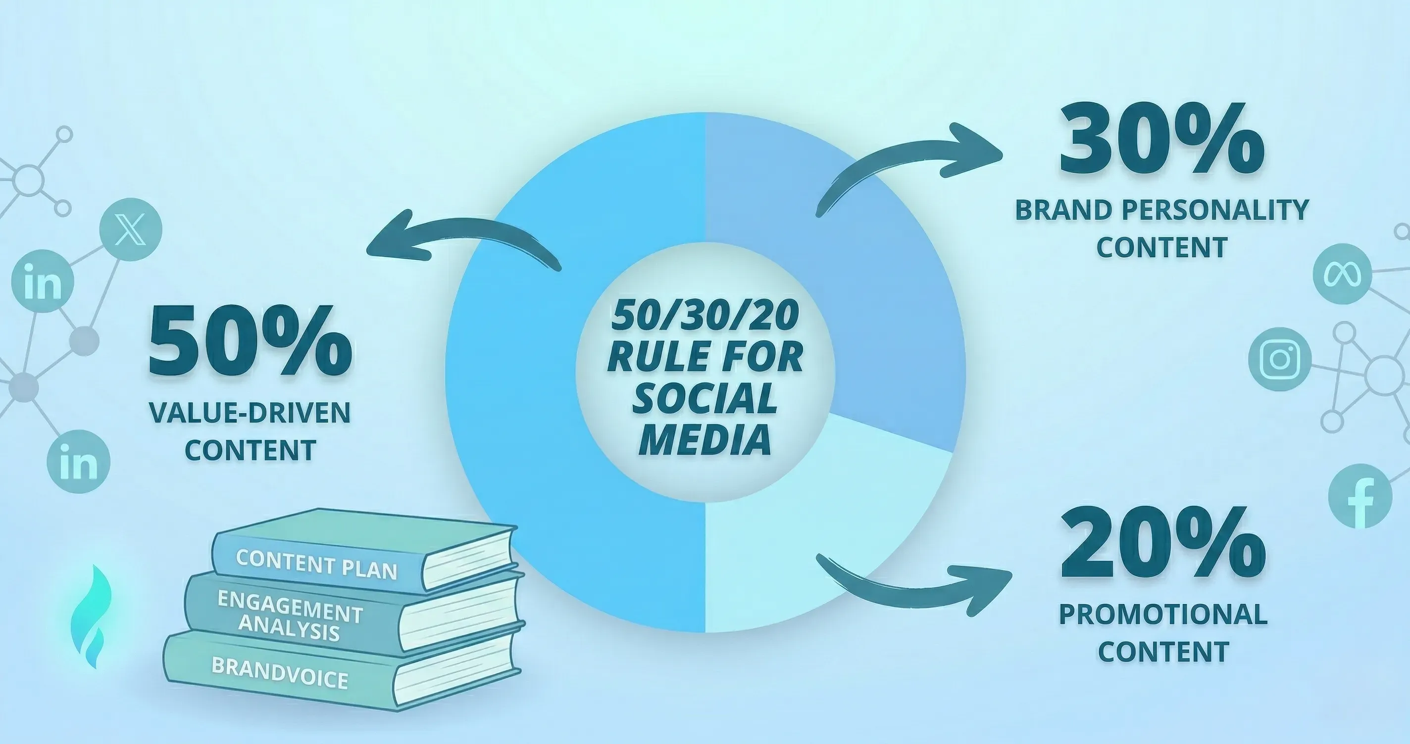 A proven starting point for content balance is the 50/30/20 framework. The 50/30/20 rule works as follows: 50% of content is for audience engagement and entertainment, 30% is for informing and educating the audience, and 20% is for direct brand promotion. Sprout Social This ratio ensures you are consistently delivering value before asking for anything in return, which builds the trust that eventually converts.